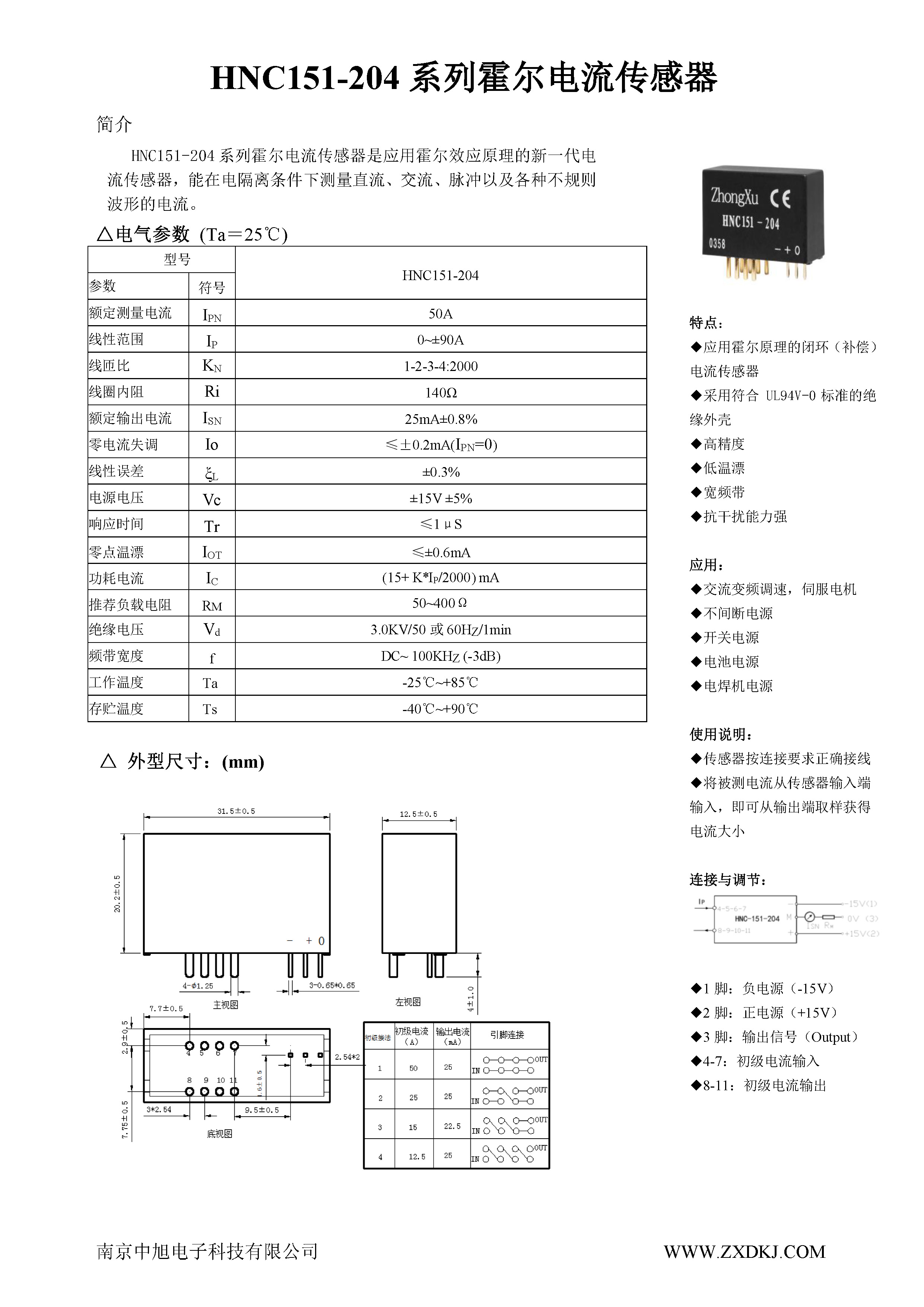 HNC151-204系列霍爾電流傳感器是應用霍爾效應原理的新一代電流傳感器,能在電隔離條件下測量直流、交流、脈沖以及各種不規則波形的電流。